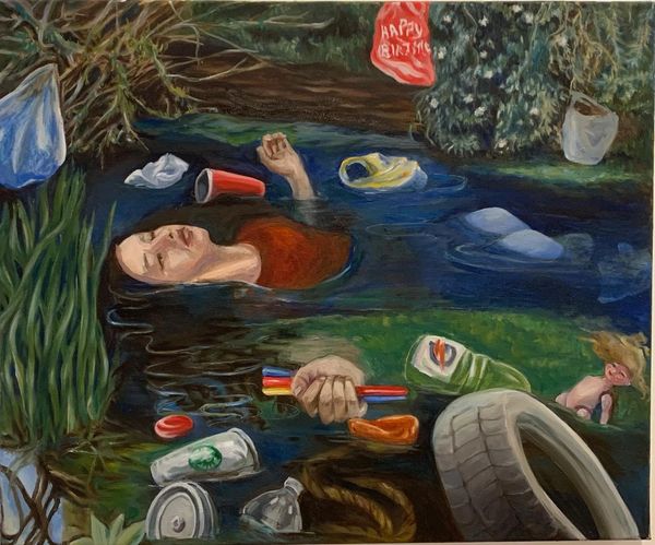 Our rampant consumption of plastics for personal convenience has led to the contamination of our waterways. As a reference for this painting, I chose Ophelia, by John Everett Millais, intending to contrast the tragic but beautifully poetic drowning of Shakespeare’s character with the horrendous destruction we are imposing on our environment. Thus, Ophelia drowns in a muddy brook surrounded by disposable plastic straws, balloons, cups and plastic toys.
