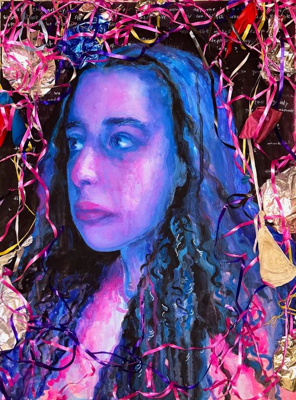 This self portrait is an experimentation with light. Pink is a happy warm color, while blue and dark tones are cold hues. Reflected party lights indicate enjoyment in contrast with surrounding trash (used balloons) seen only after the party. When the lights are on and the party is happening, no one wants to the think about the fate of materials needed the make an event seem fun.