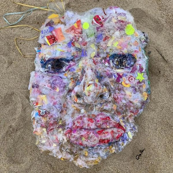 Only 6% of plastic is actually recycled. For a month, every piece of disposable plastic my family used was not put into a recycling bin or thrown out, but collected for this sculpture. The base consists of cut-up berry clamshells, takeout containers and hard frozen dinner holders. Glued on top are soft plastics from food packaging. I placed this face sculpture on a beach to get people's reaction since most plastic ends up in our oceans and on our beaches. We are the face of plastic consumption.