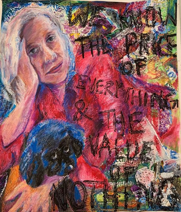 The subject is my mom and our beloved dog, Olive. I chose to collage packaging into their portrait because the plastic we purchase is forever on the planet and therefore always with us. We understand the cost of convenience products yet still need to find and observe alternatives or we all pay.