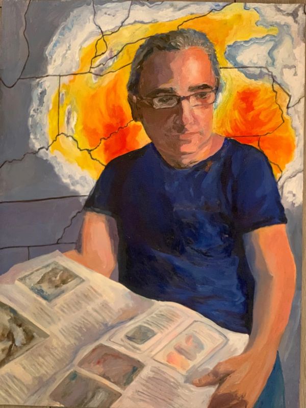 This is a portrait of my father reading the Sunday New York Times, a favorite weekend activity for my parents. Behind him is a weather map of a hurricane. Inside our home, news can feel far away, but dramatic conditions are always present somewhere in the world.